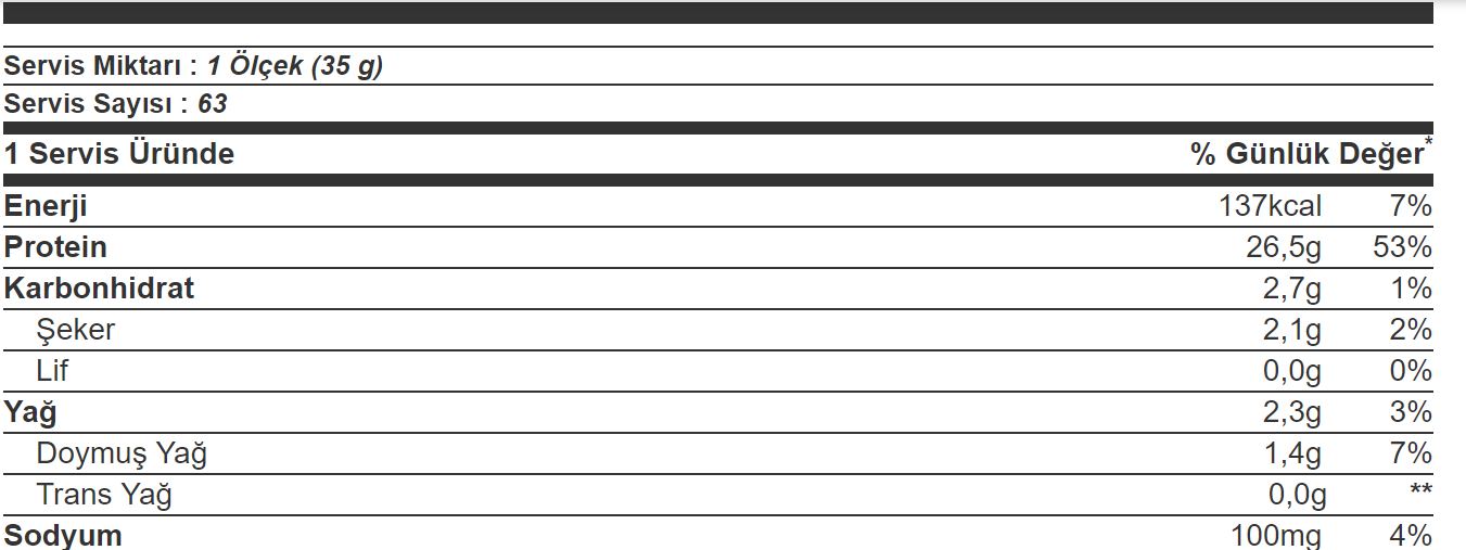 Servis miktarı 1 Ölçek (35 g)tir. Olimp Whey Protein 2200 Gr paketin içerisinde 73 servislik ürün vardır.1 Serviste (35 g) için besin değerleri ;